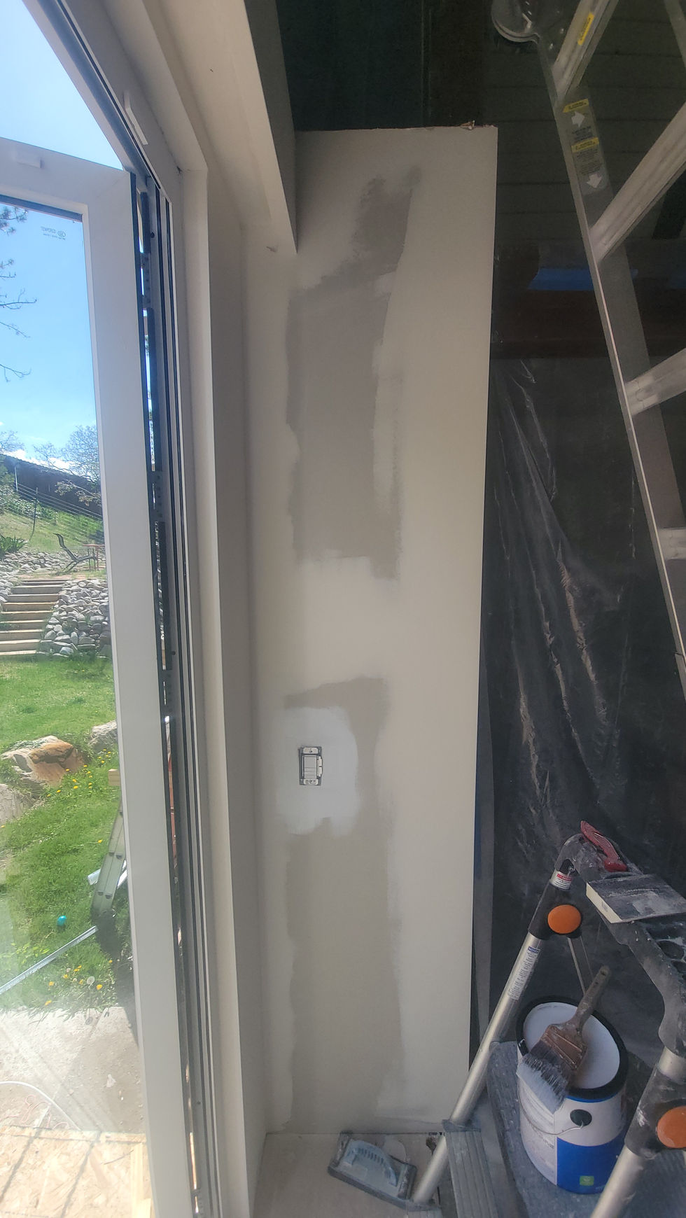 A collection of images showcasing interior renovation work, including drywall mudding and painting preparation.